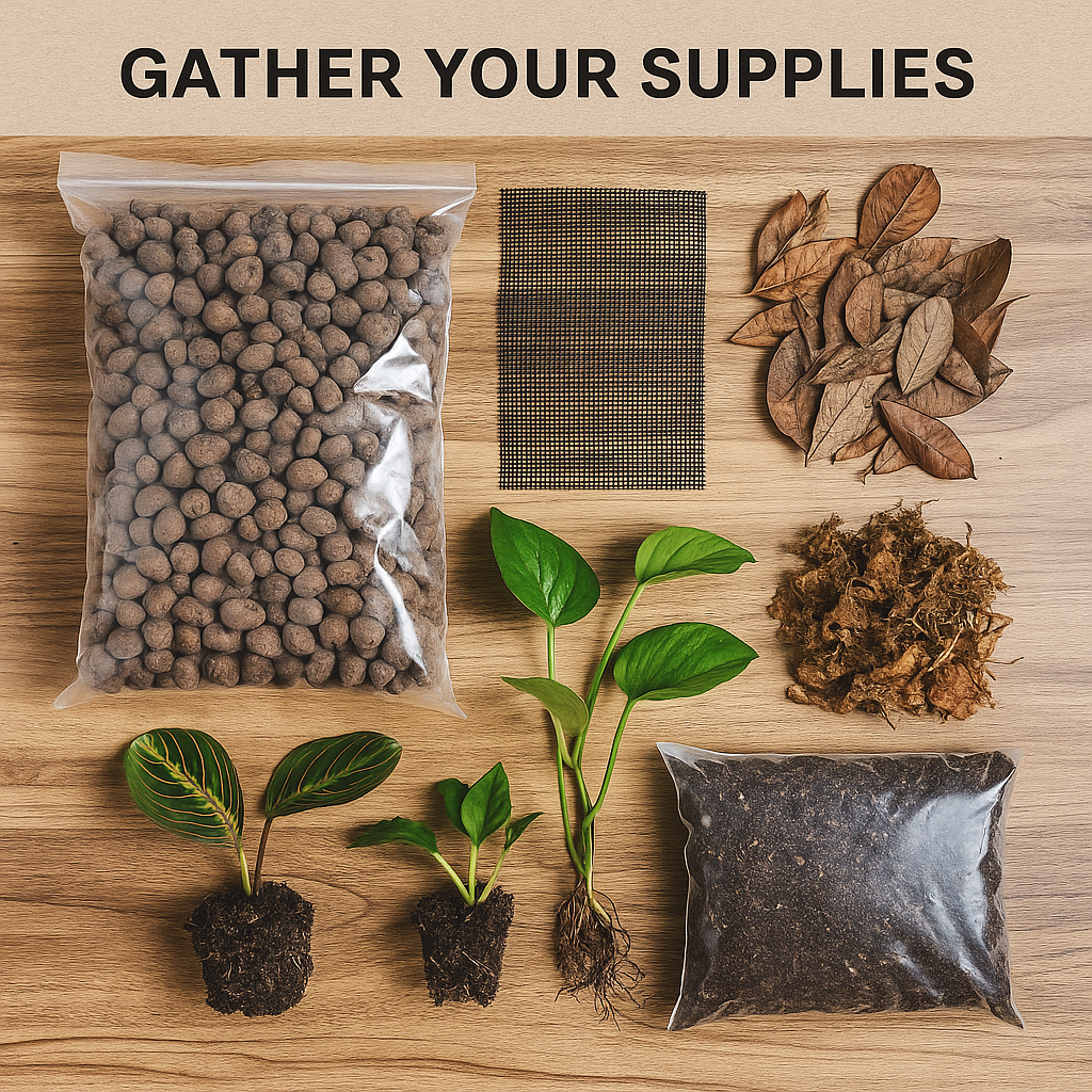 - Drainage 1–2″ (2.5–5 cm): Use LECA or a false bottom to catch excess water; include an access point or bulkhead for draining. Cover with mesh.